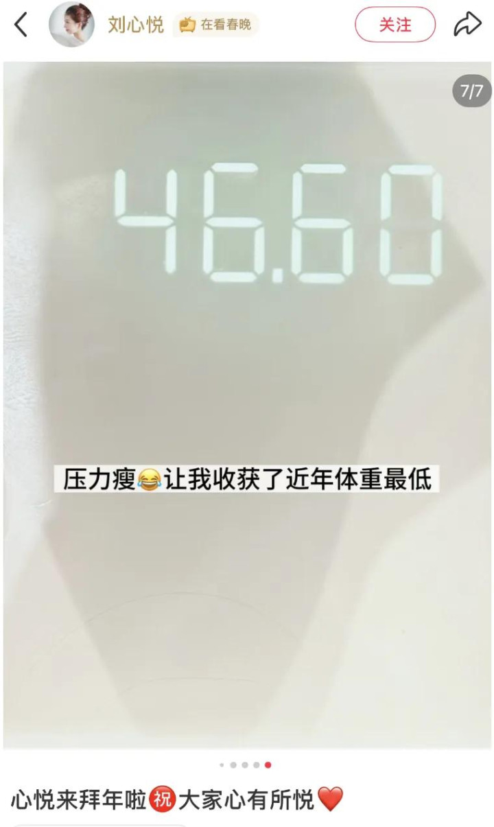 2月17日,央视春晚主持人刘心悦在社交平台发布拜年语音,祝福大家新年顺利,一切都好,并谢谢大家的祝福和鼓励,自己都收到了。并透露体重仅93斤:压力瘦,收获近年体重最低。