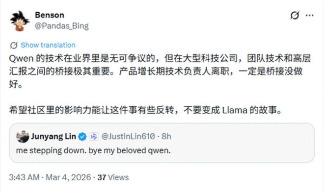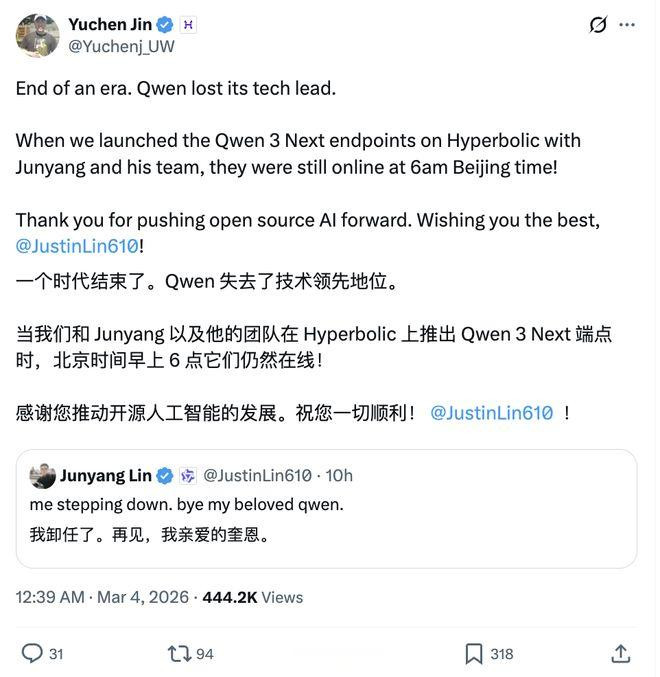 3月4日凌晨,X上这些评论在几小时内密集刷屏。起因只是一条九个单词的推文:"mesteppingdown.byemybelovedqwen."