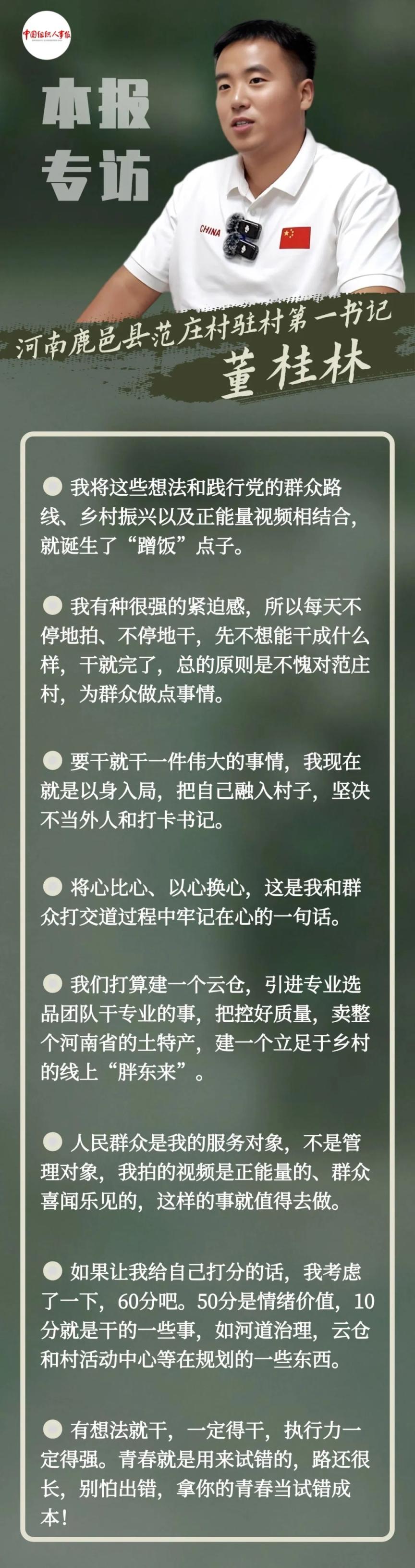 谈及网络上的爆火,这位“90后”驻村第一书记却说自己“很平静”,因为知道自己在干什么,身上扛的担子是什么,也明白未来还有很长一段路要走。董桂林是如何打开工作局面的?“蹭饭”过程有哪些感受和体会?网络销售的收入打算如何使用?请跟随本报记者,一起倾听他“蹭饭”背后的酸甜苦辣。