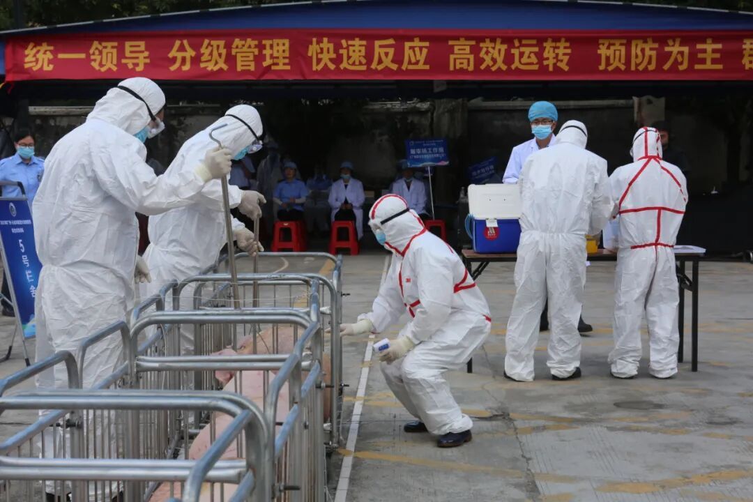 此次演练共设置了疫情诊断组、封锁检疫组、控制扑灭组、无害化处理组、消毒灭源组、后勤保障组、技术指导组、屠宰场工作组等8个应急小组,采用“现场实战演练+音视频解说”相结合的方式,模拟生猪屠宰场对一批从外市购入的待宰猪被确诊非洲猪瘟疫情后,按照疫情发现与诊断、疫情报告与先期处置、应急响应与应急处置、应急响应终止与善后处置等环节依法依规开展全流程应急处置。