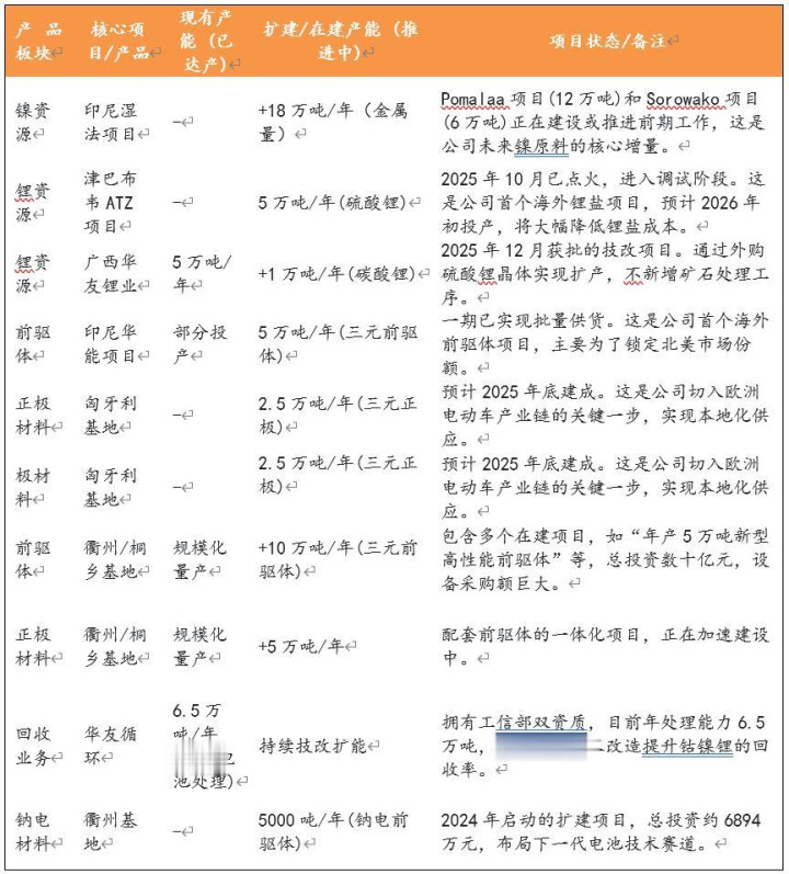 当前,华友钴业的产能扩张呈现出明显的海外倾斜趋势。其基地布局从早期的国内(衢州、广西)转向了更具战略性的印尼(服务于欧美市场)与匈牙利(聚焦欧洲市场)。这一布局不仅能有效应对贸易壁垒,也强化了与LG、大众等全球核心客户的协同关系。