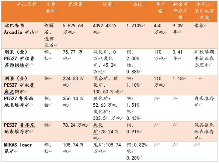 其中刚果金 PE527 矿权权项目剩余可开采年限仅 0.41 年、 1.18 年,但鉴于公司在当地布局多年,矿权续期手续正在办理中,预计可通过勘探和收购补充资源。
