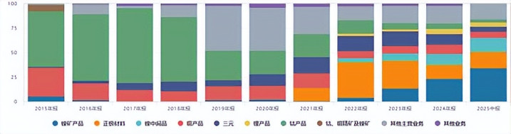 从主营业务收入来看,华友钴业在2018年以前都是以钴产品为主,2019年起锂电新材料放量,即三元前驱体、锂产品、镍产品等。
