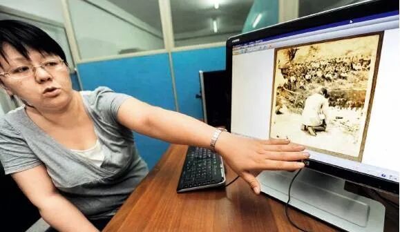 中国第二历史档案馆工作人员展示申报档案中由日军拍摄的屠杀照片