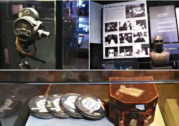 约翰·马吉拍摄的南京大屠杀影像,图为电影摄影机、胶片盒、杂志内页等文物