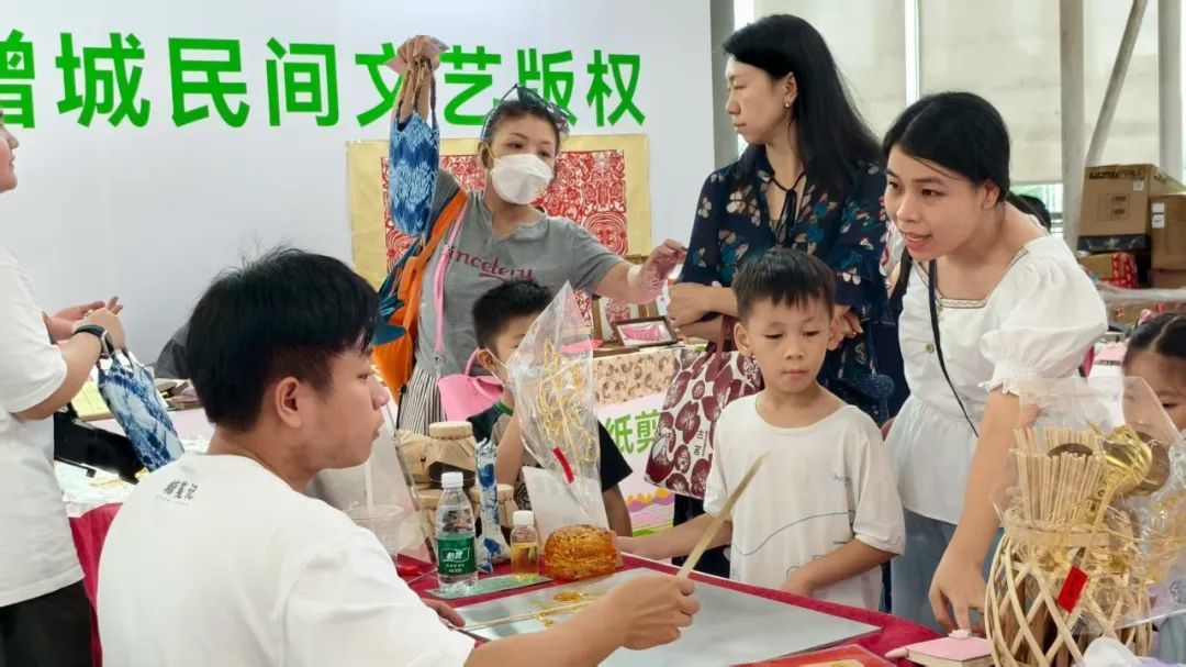 而在增城民间文艺版权展区,来自我区的非遗展商带来木雕版画、泥塑、扎染、剪纸、糖画、榄雕、何仙姑与挂绿的传说、篆刻等8项非遗项目集体亮相,非遗传承人现场展示的精湛技艺,吸引了不少市民围聚观摩,不时发出赞叹,亲身体验传统技艺的独特魅力。从精美的木雕版画到绚丽的扎染,从灵动的剪纸到甜蜜的糖画,每一项非遗都承载着增城深厚的历史文化底蕴。而一系列融合非遗元素的文创产品,如以榄雕为灵感的钥匙扣、扎染图案的袋子等,巧妙地将传统非遗与现代生活紧密相连,既实用又具艺术价值,让市民把“非遗”带回家,让传统文化融入日常。