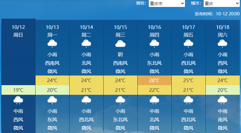 城市中,要特别关注重庆,未来一周重庆几乎都是在雨水中度过。小伙伴们一定要雨具随身,别被淋湿了。